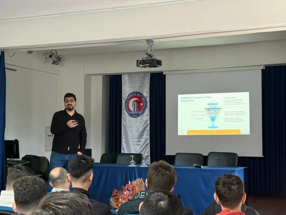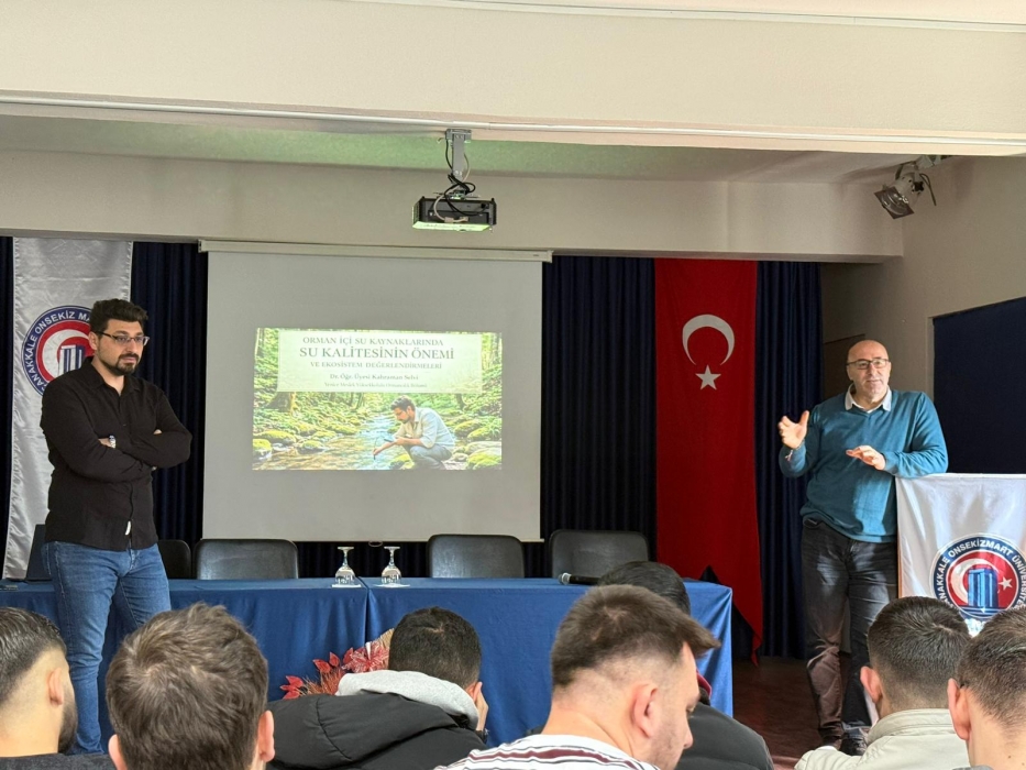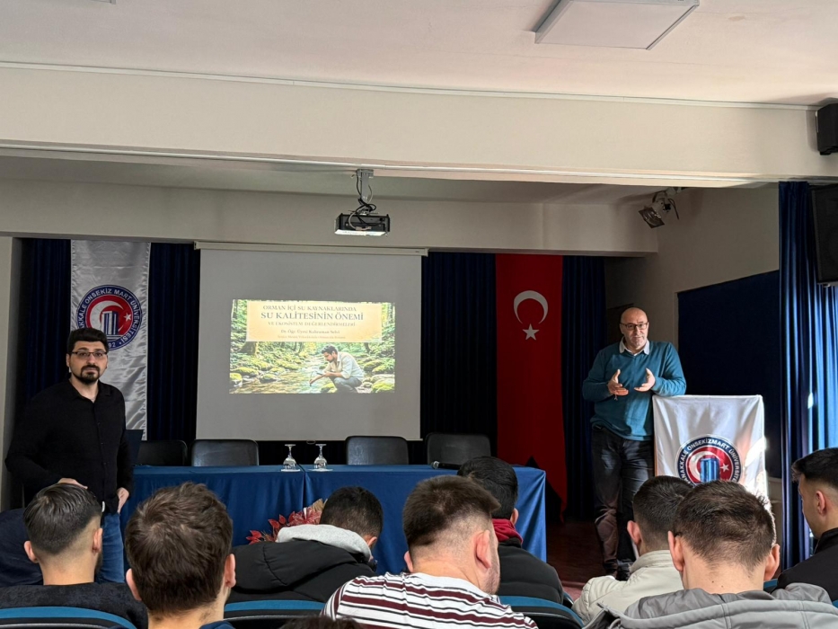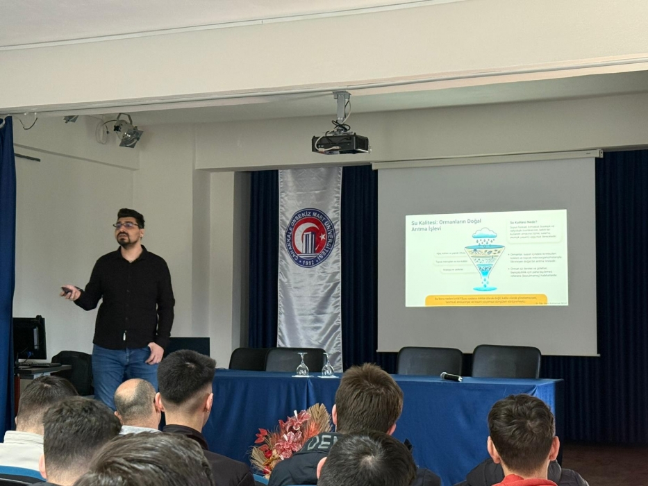 Yenice Meslek Yüksekokulu Konferans Salonu’nda gerçekleşen seminerde; orman ekosistemleri ile su döngüsü arasındaki ilişki, ormanların yağış ve su rejimi üzerindeki etkileri, su kalitesinin ormancılık açısından önemi ve korunmasına yönelik yasal çerçeve ele alınmıştır. Ayrıca, su kalitesini etkileyen başlıca tehditler kapsamında orman yangınlarının rolü ile sucul ekosistem değerlendirme yöntemleri ve izleme süreçlerinde yapay zekâ uygulamalarına değinilerek mesleğimizin geleceğine dair farkındalık oluşturulmuştur.